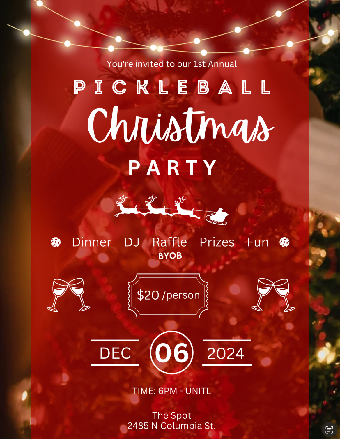 You’re invited to our 1st Annual Pickleball Christmas Party. Join us for Dinner, DJ, Raffle, Prizes and Fun! Celebrating another year of Pickleball and sharing some exciting news!
