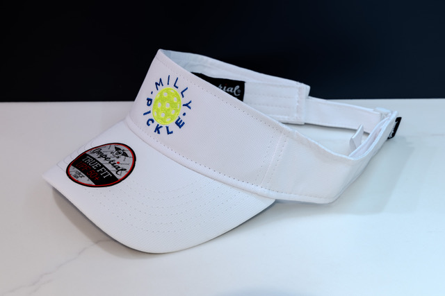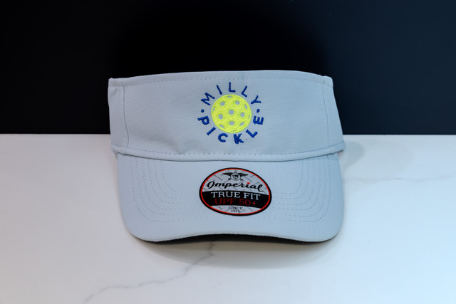 Our first ‘Milly Pickle’ branded merchandise is available during the month of May. We are offering the baseball hat and visor in Fog and White, with Milly Pickle embroidered in blue. See photos of our awesome new merch! Both the hats and visor are the Imperial Brand. This brand is lightweight, comfortable, provides sun protection and is the ‘Official Licensed Headwear of Major League Pickleball.’